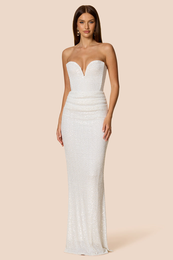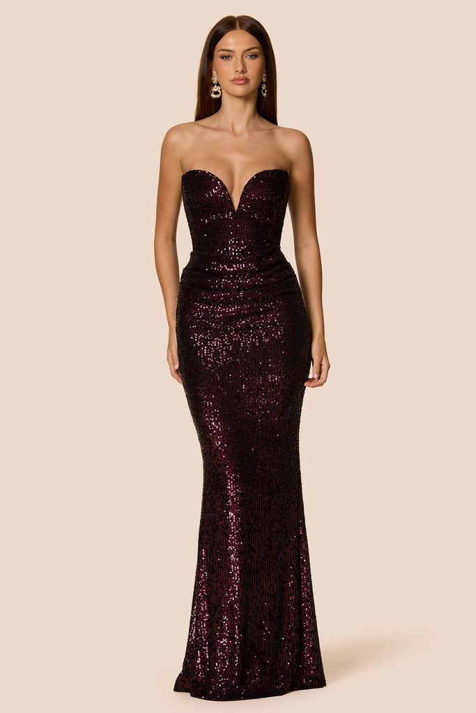 Classic elegance meets modern glamour. Designed to make a statement, this strapless gown features a plunging sweetheart neckline and a sculpting silhouette that with a flattering draped skirt. Crafted in our signature stretch sequin with boning throughout the bodice for a snatched look. Invisible zip at back, fully lined.