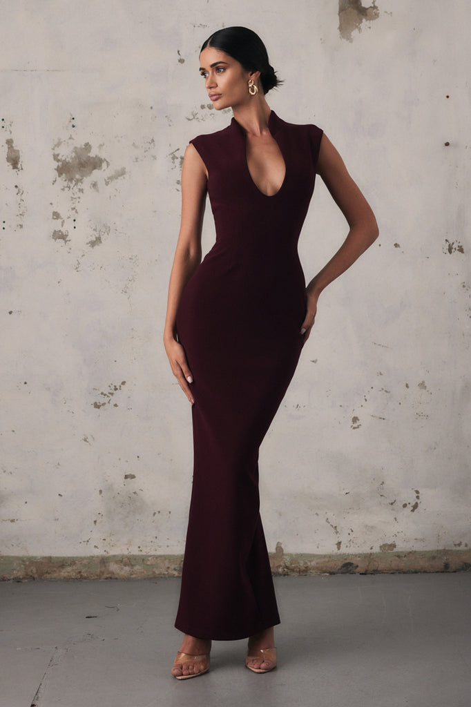 Classic maxi dress with 2-way plunge neckline and striking wide shoulders and split at back hem. Crafted from a stretch bonded crepe, with invisible zip at back, fully lined.