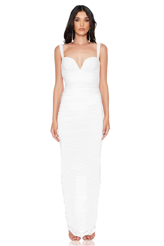 Daring maxi designed to have all eyes on you. Crafted from our signature blend of classic scuba crepe and luxe mesh, this incredible style features a fitted bodysuit full lining with a split at the back hem for ease of wear.
