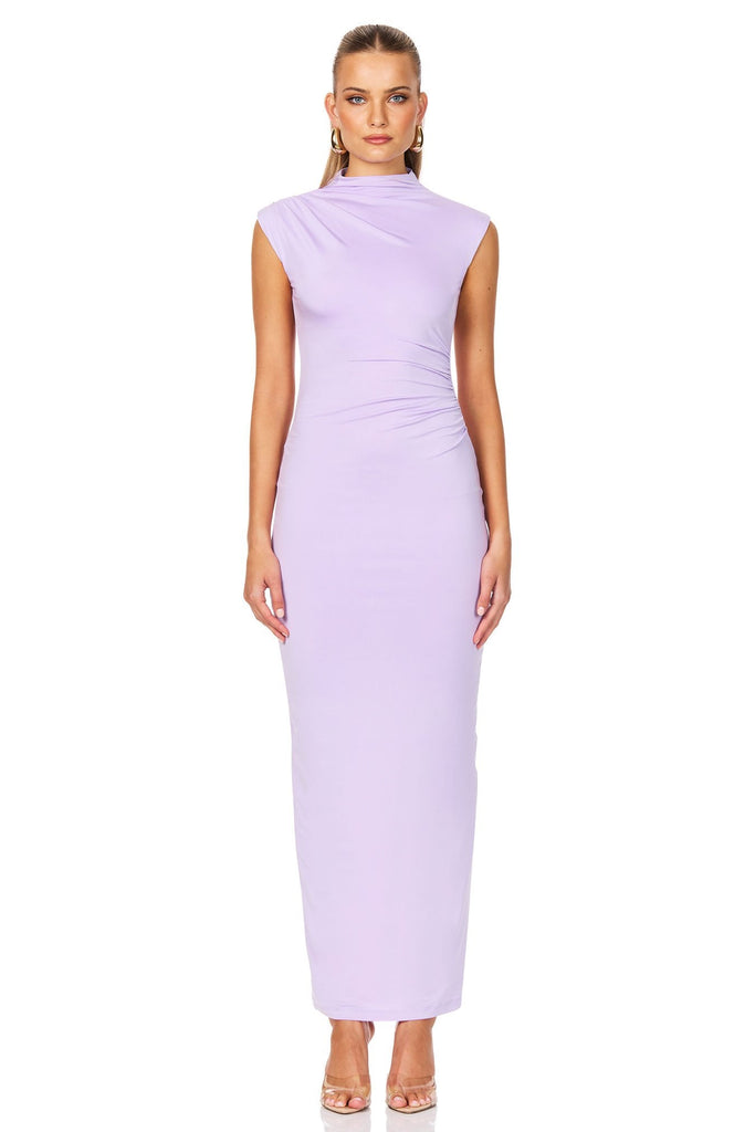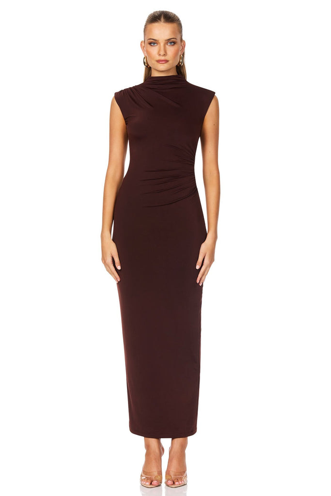Stunning high neck midi dress, crafted in our slinky jersey. Featuring subtle gathering on shoulder and at front waist, invisible zip closure at back neck and g-string pant. Flattering column silhouette, fully lined.