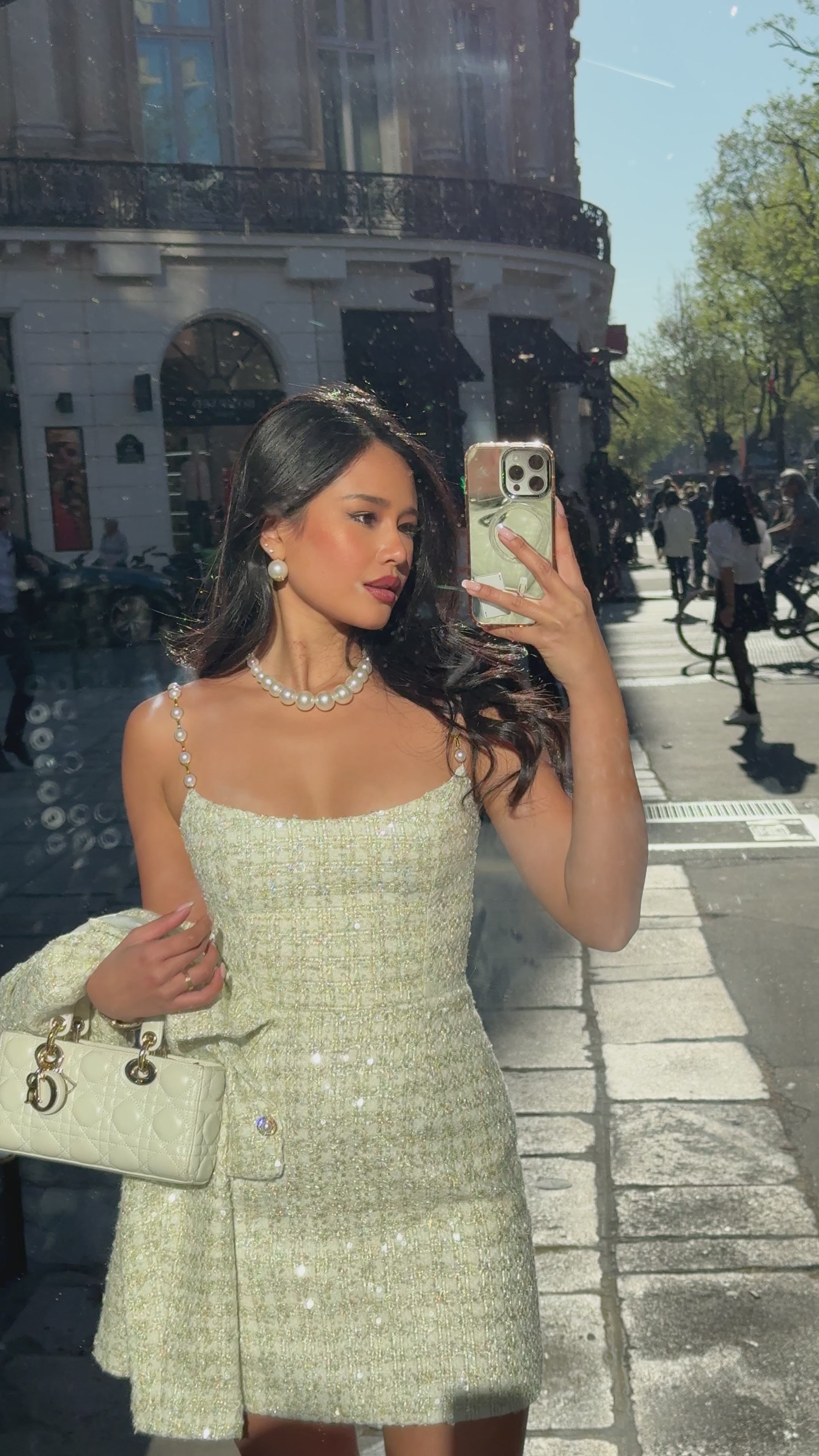 Sophisticated fitted mini dress crafted in a tweed suiting fabrication with mini sequins and pearl straps. Invisible  zip at back, fully lined.
