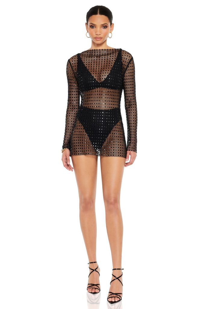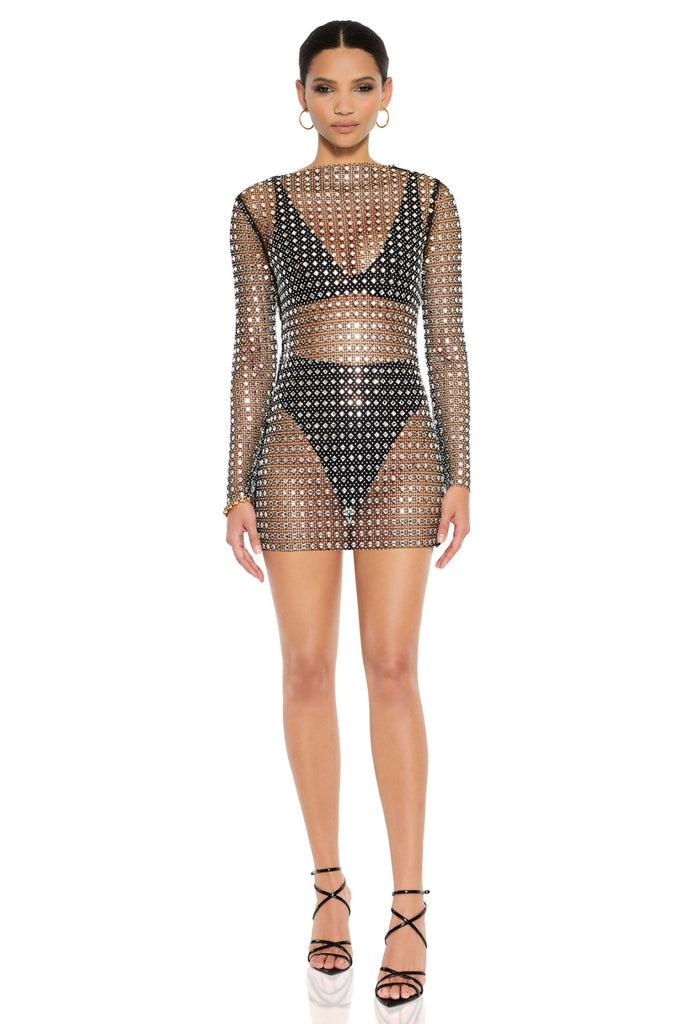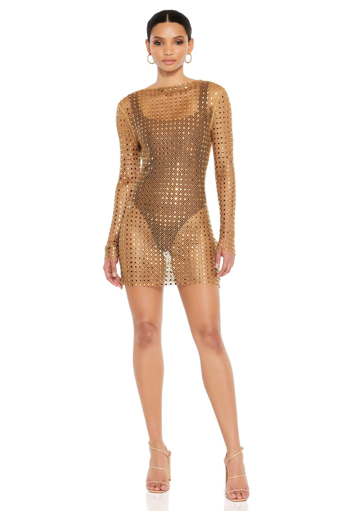 Each garment is unique and placement of stones vary between each piece. This garment is delicate, please remove all jewellery and take care when trying it on to avoid damage. Shimmer & shine in this iconic design. Made from our sparkling diamante fabric with a high neck & long sleeve. Zip closure at the side.