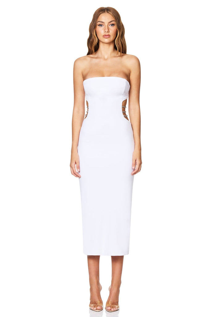 Glamorous strapless midi crafted from our classic stretch crepe. Features a body-hugging fit, cut-outs & diamanté straps at the side waist & a split at the back hem. Invisible zip closure at back, fully lined.
