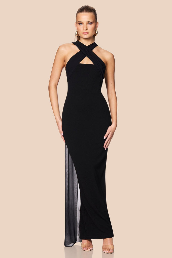 Incredible strapless gown with structured inner bodice crafted in our signature scuba crepe. Featuring dramatic chiffon ties to be worn 2 ways. Invisible zip at back. Fully lined.