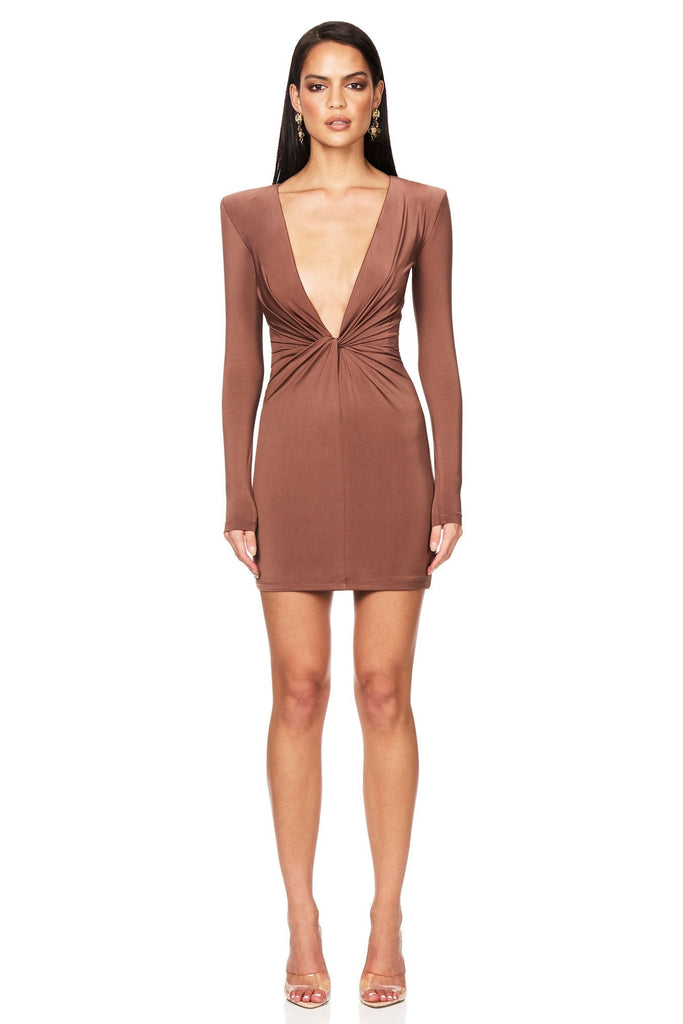 Head-turning long sleeve mini designed in our signature soft jersey. Features a sexy low-cut neckline, chic twist detailing at the waist and a strong shoulder.