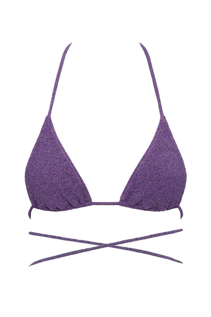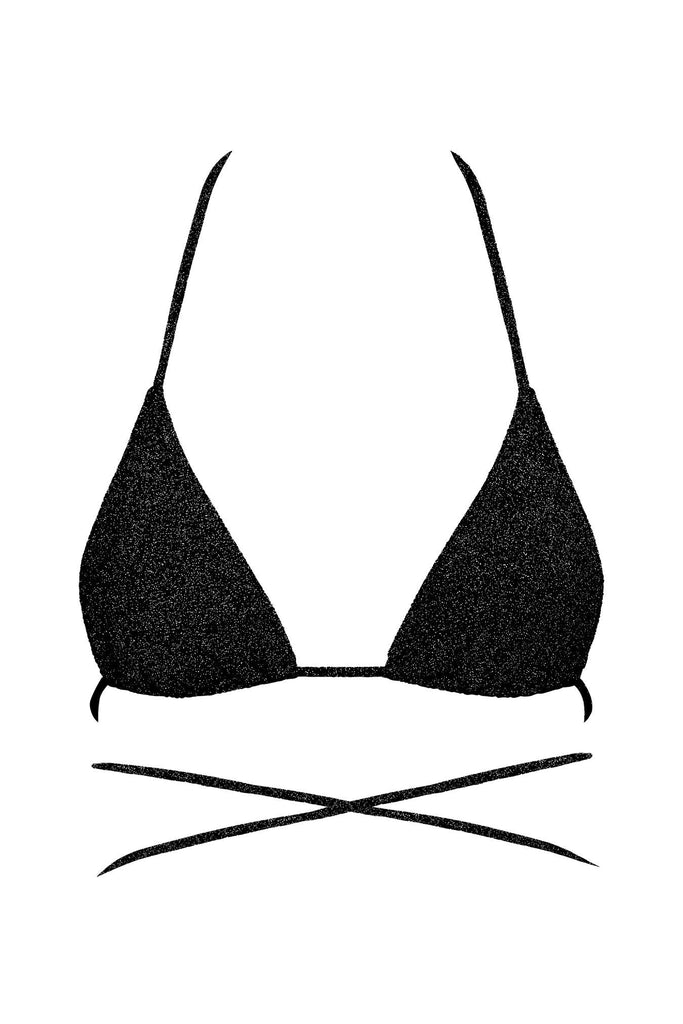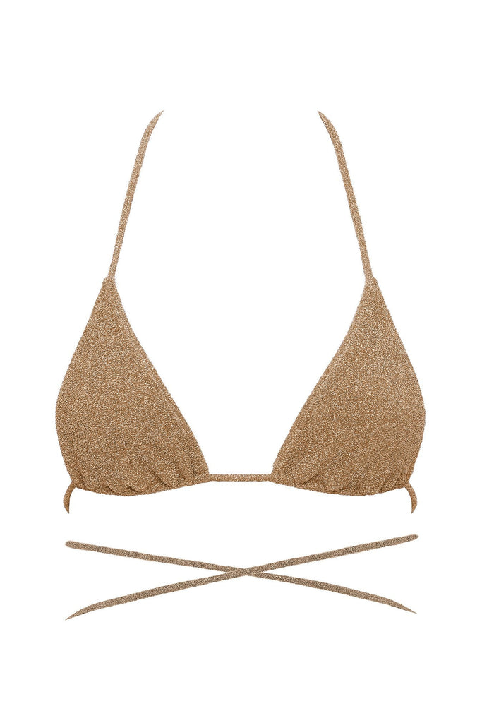 Shine bright in our signature sparkling lurex. Classic triangle style with extra long string ties that can be worn in a wrap style at the waist.