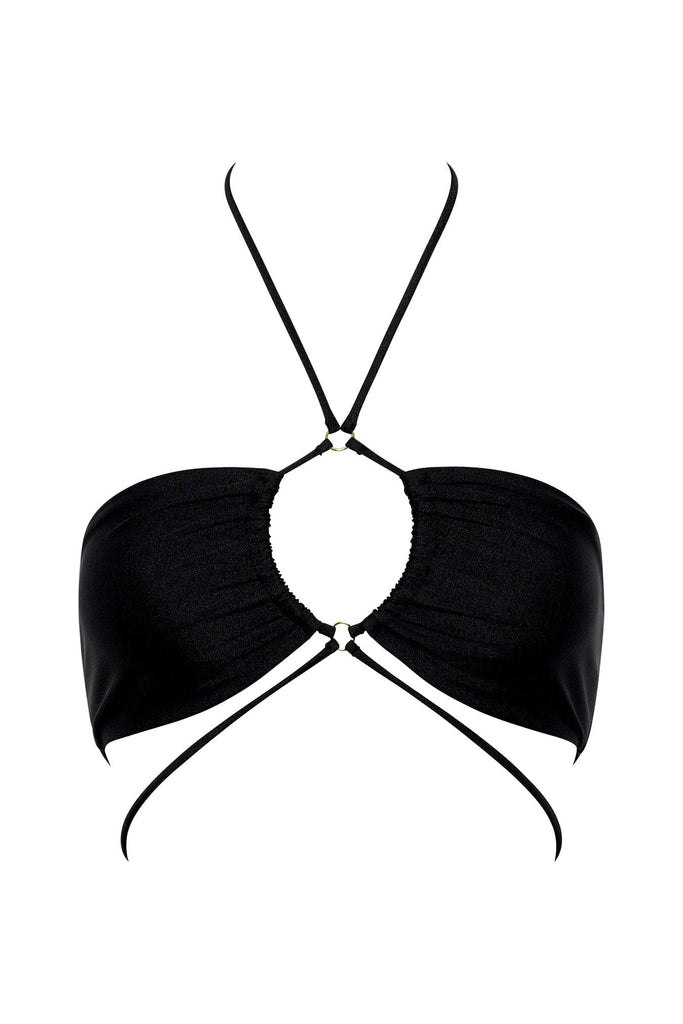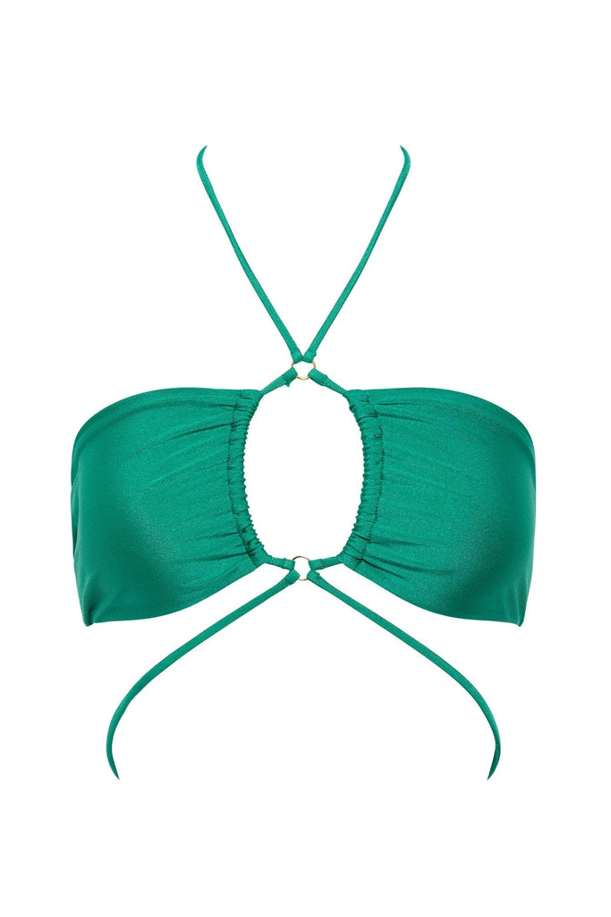 Chase the sun in this staple bandeau style. Features flattering ruching, a striking cut out at the centre bust & extra long ties that can be worn wrapped at the waist. Halter tie & gold clip closure at back.