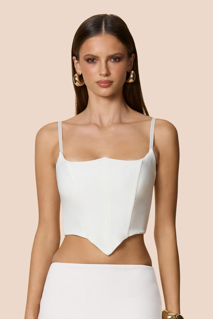 Gorgeous sculptured top, cropped at waist with inverted points for a feminine look. Crafted from a woven fabrication with a firm stretch. Adjustable straps and zip closure at back. Fully lined.