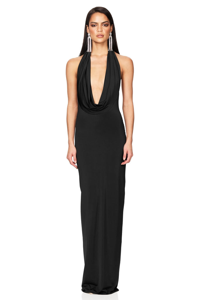 Add a touch of romance to your wardrobe with our alluring Element Gown. Crafted from a slinky jersey fabrication with a low draped neckline and stunning open back