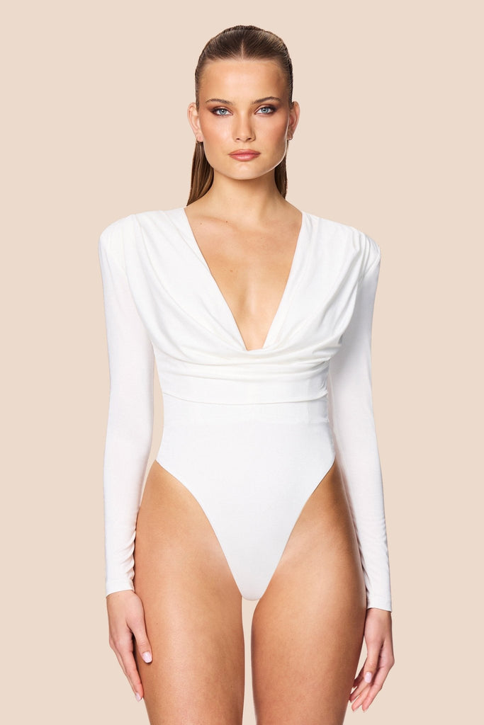 Perfect long sleeve bodysuit with draped neckline and accentuated shoulders.