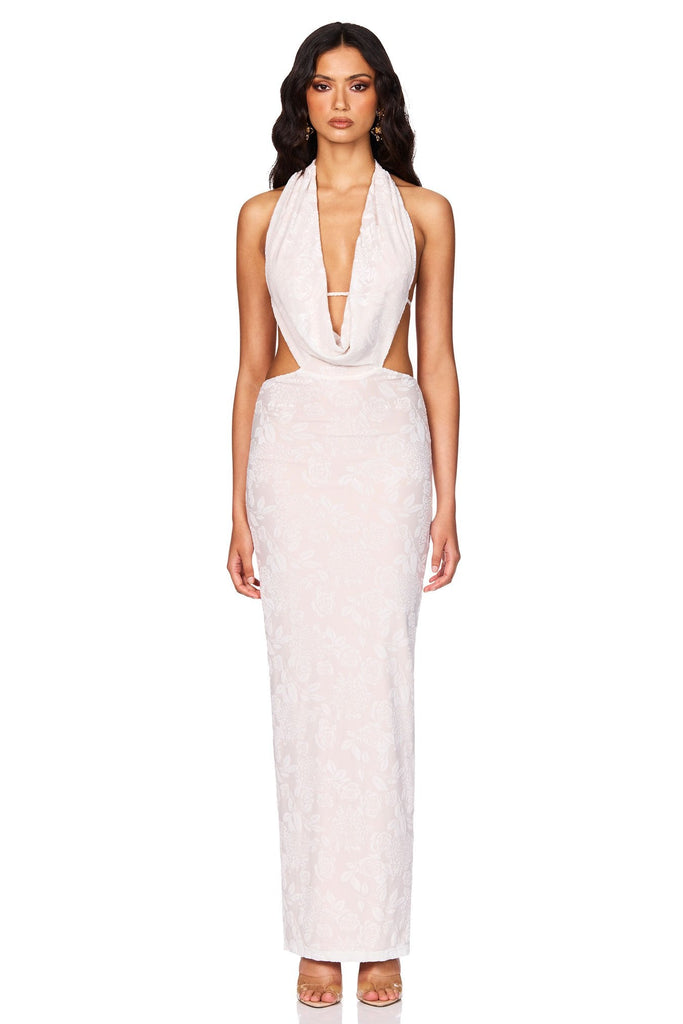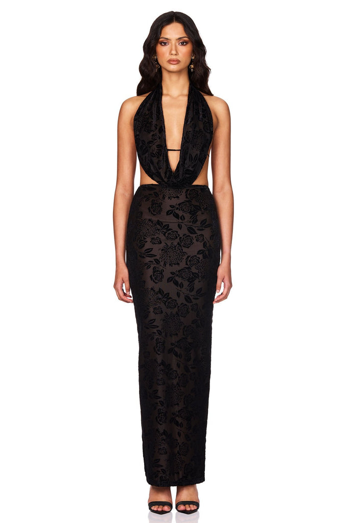 Dramatic cut out gown, crafted in a semi-sheer velvet devore fabrication. Featuring a plunging draped neckline, cut out detail at front waist and sexy low back. Halter ties at neck, adjustable strap at back and invisible zip at back waist. Striking column silhouette. Fully lined.
