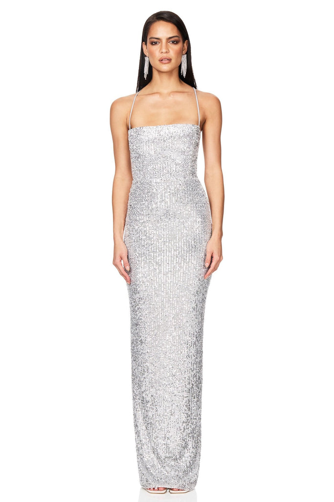 Decadent floor length design crafted from our shimmering stretch sequin. Features a nipped waist, flattering side gathers and an exquisite lace up back. Fully lined with a zip closure and split at the back hem for ease of wear.