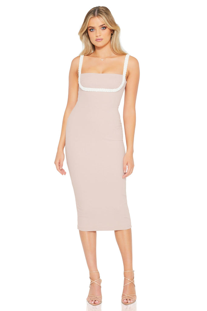 Beautiful bodycon style midi crafted from figure hugging scuba crepe. Features stunning pearl details at the bust & straps and a split at the back hem for ease of wear.