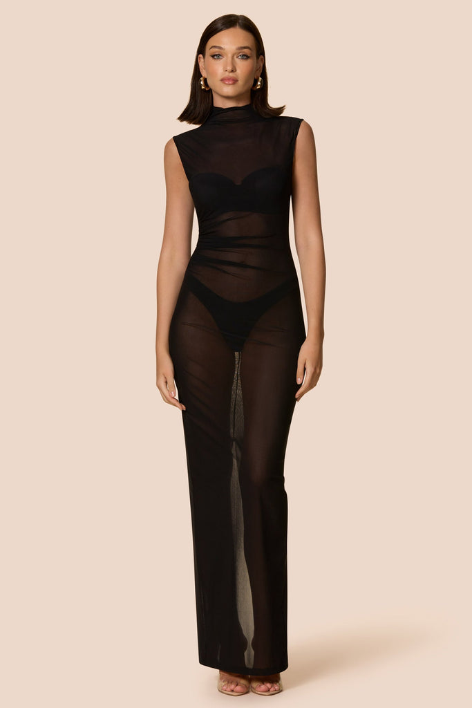 Statement mesh maxi dress with flattering gather at side front at back. Crafted in a sheer mesh fabrication. High neck with invisible zip at back and split at hem. Unlined. Available in plain or crystal mesh fabrication.